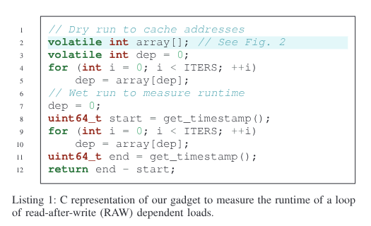 | int probe(void* adrs) { volatile unsigned long time; asm __volatile__ ( " mfence \n" " lfence \n" " rdtsc \n" " lfence \n" " movl %%eax, %%esi \n" " movl (%1), %%eax \n" " lfence \n" " rdtsc \n" " subl %%esi, %%eax \n" " clflush 0(%1) \n" : "=a" (time) : "c" (adrs) : "%esi", "%edx" ); return time; }